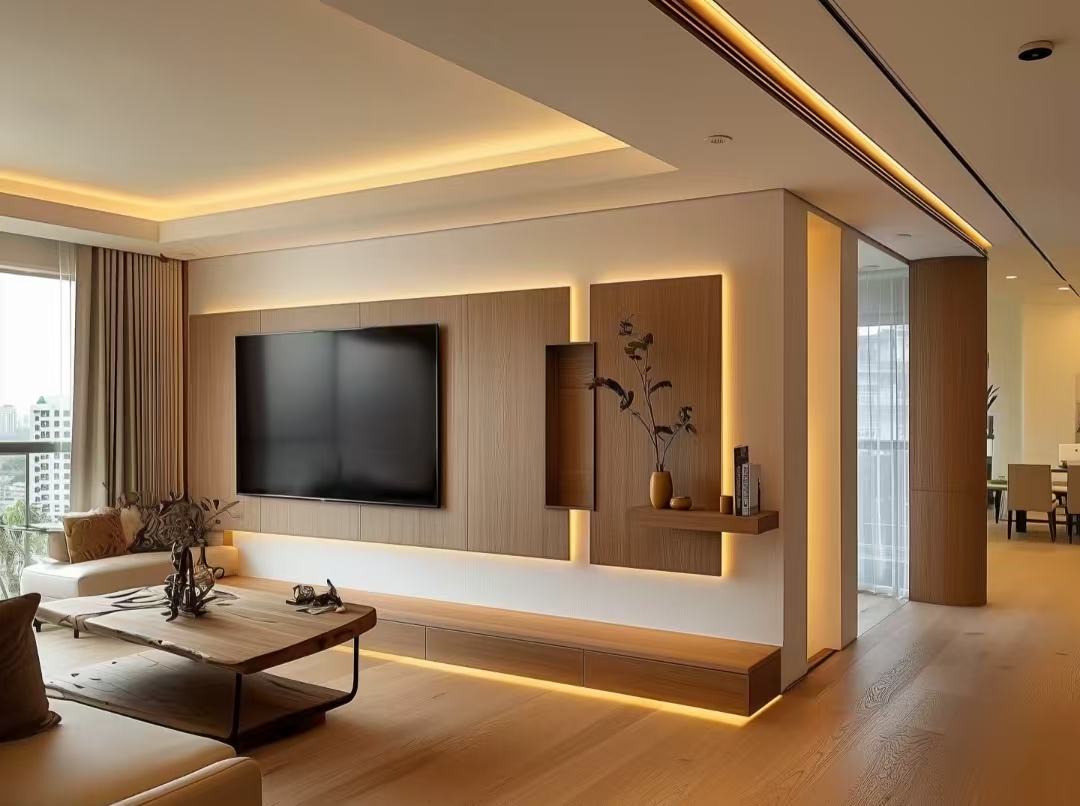 Minimalistická televizní stěna s čistými a ostrými geometrickými tvary.