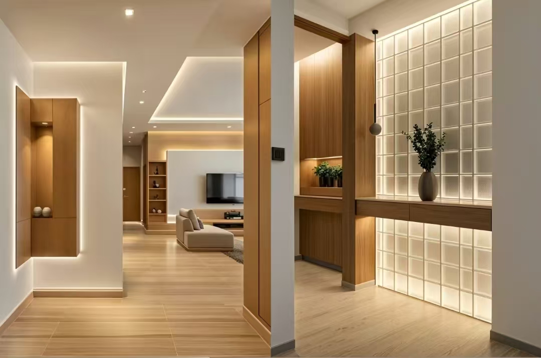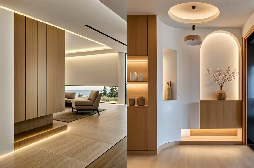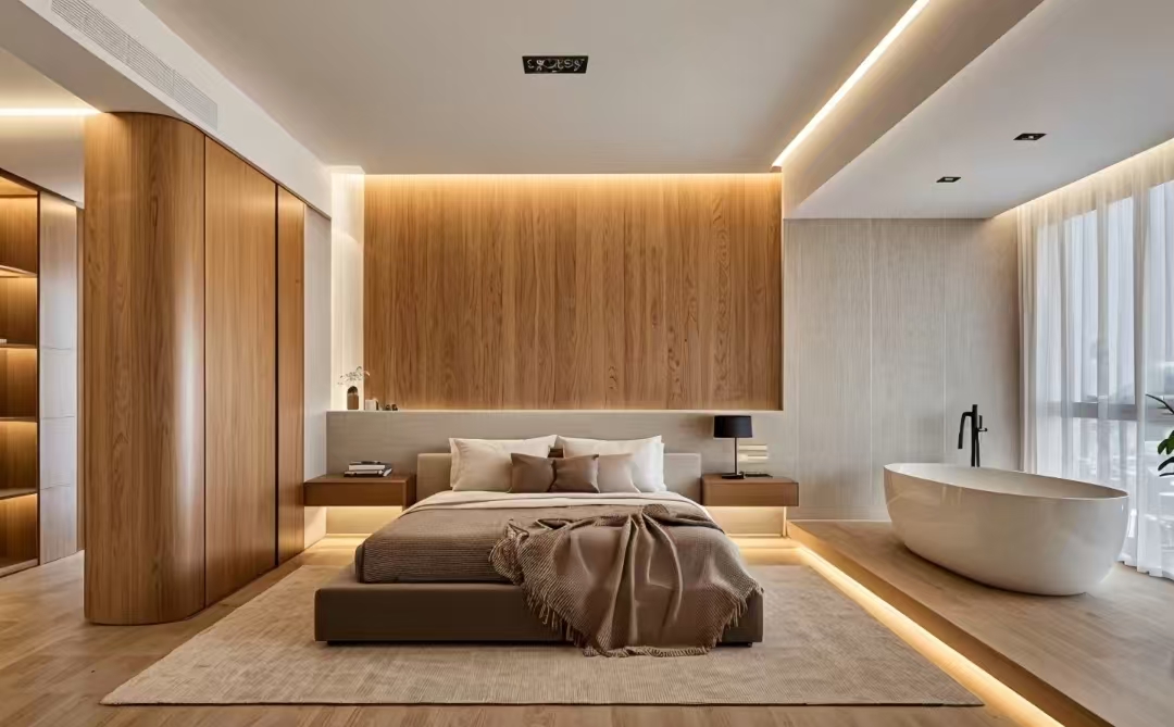 Dřevěné povrchové úpravy poskytují jemný dotek, mísí teplé a chladné tóny.