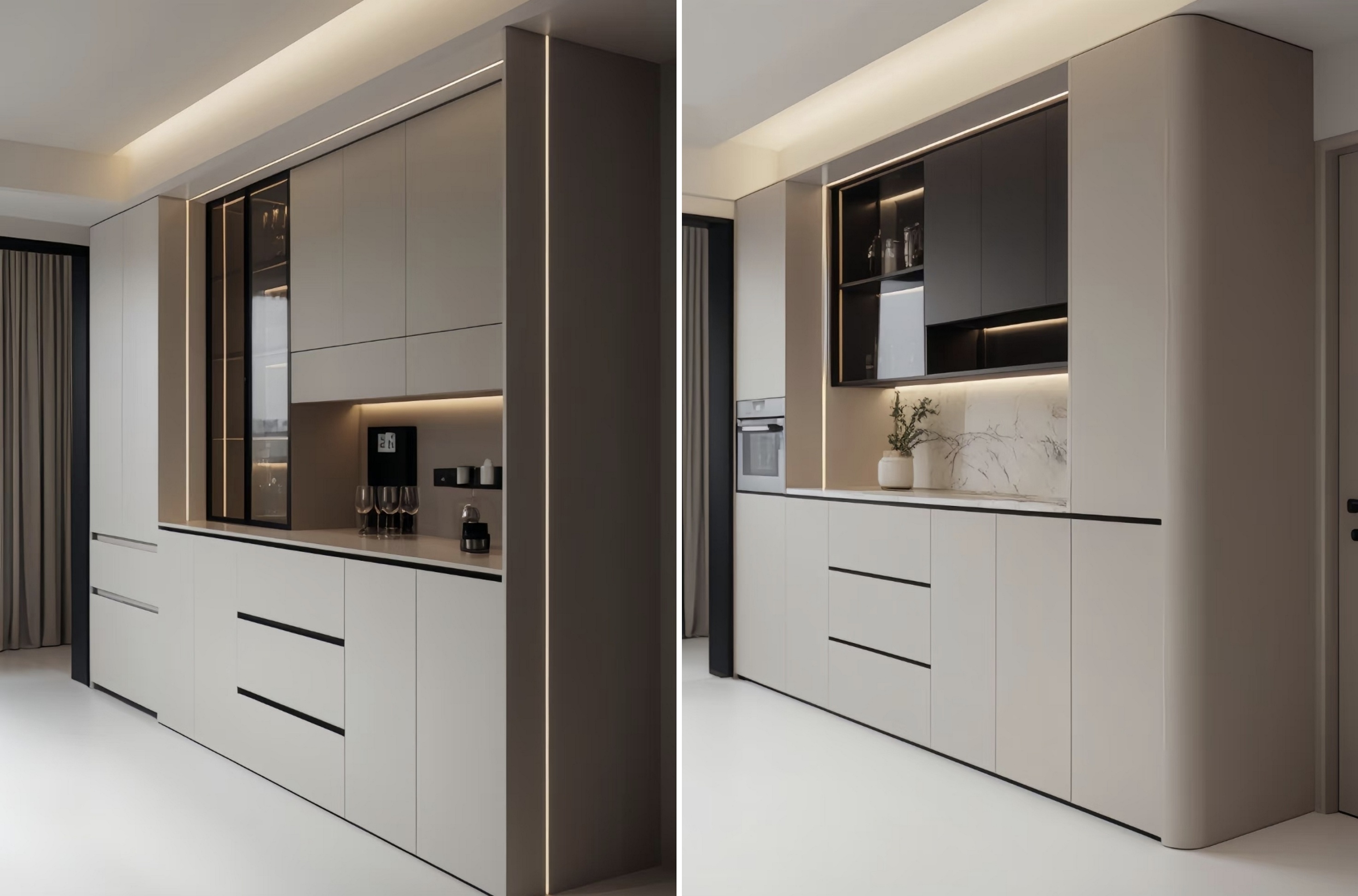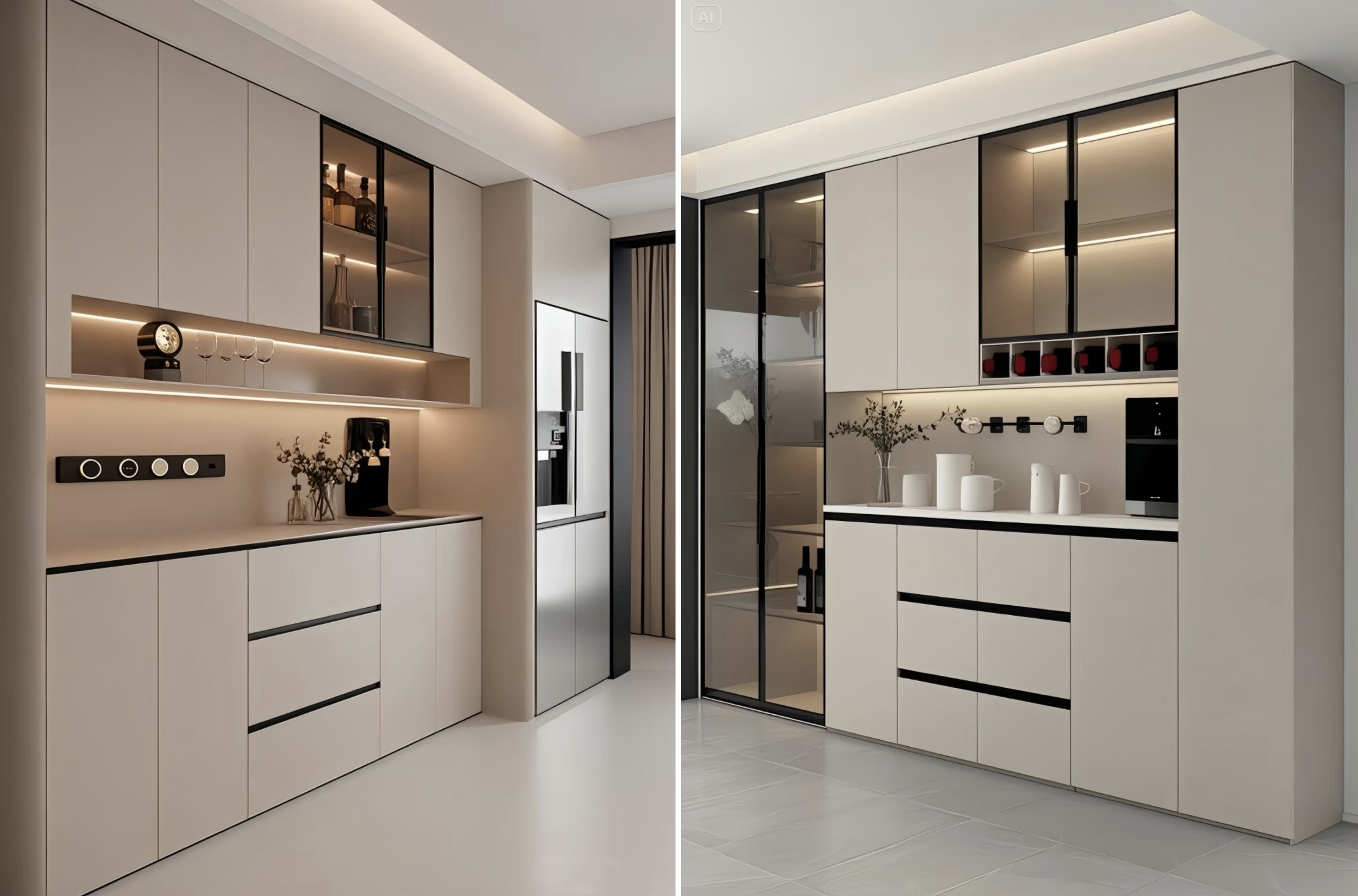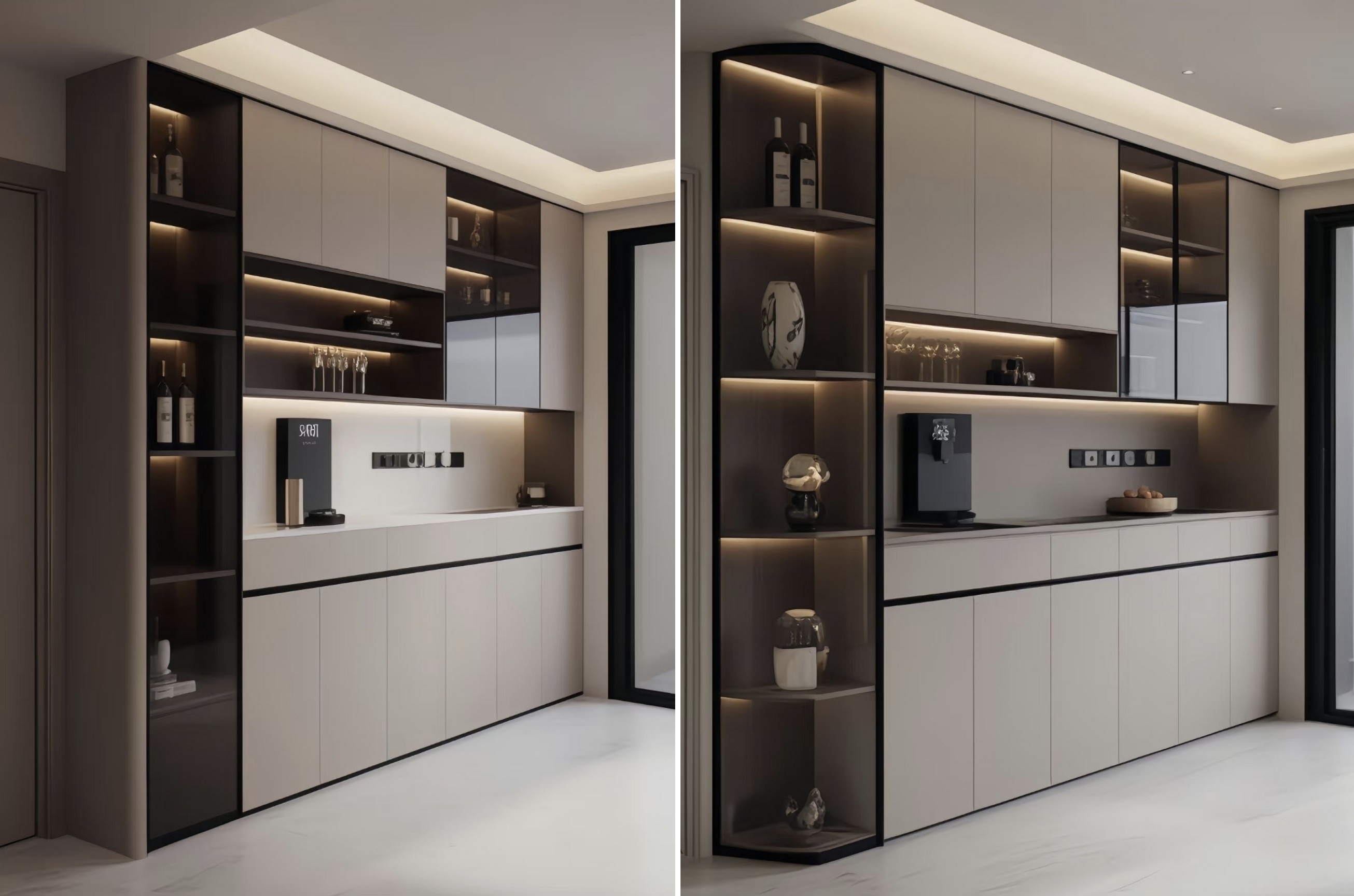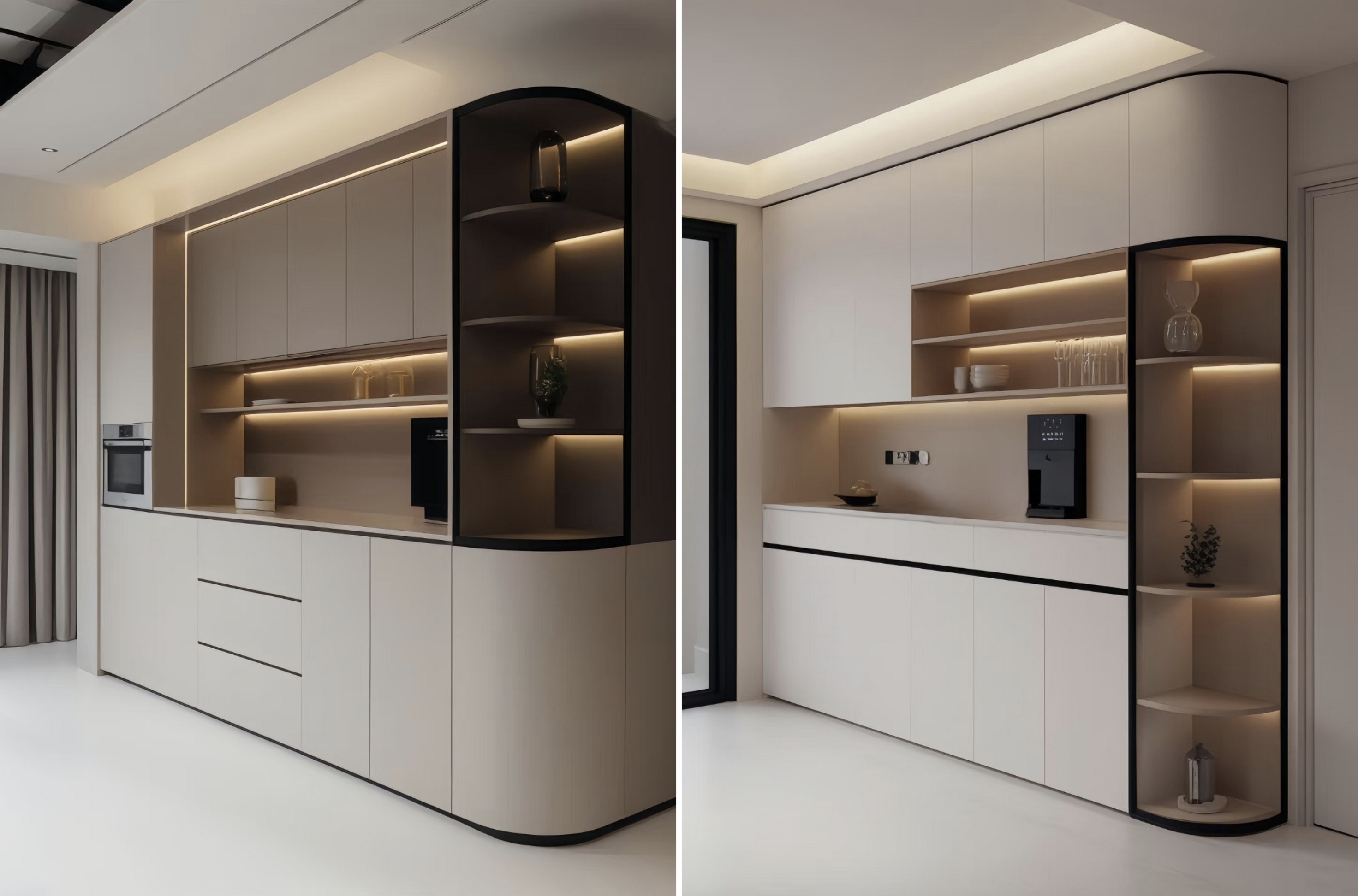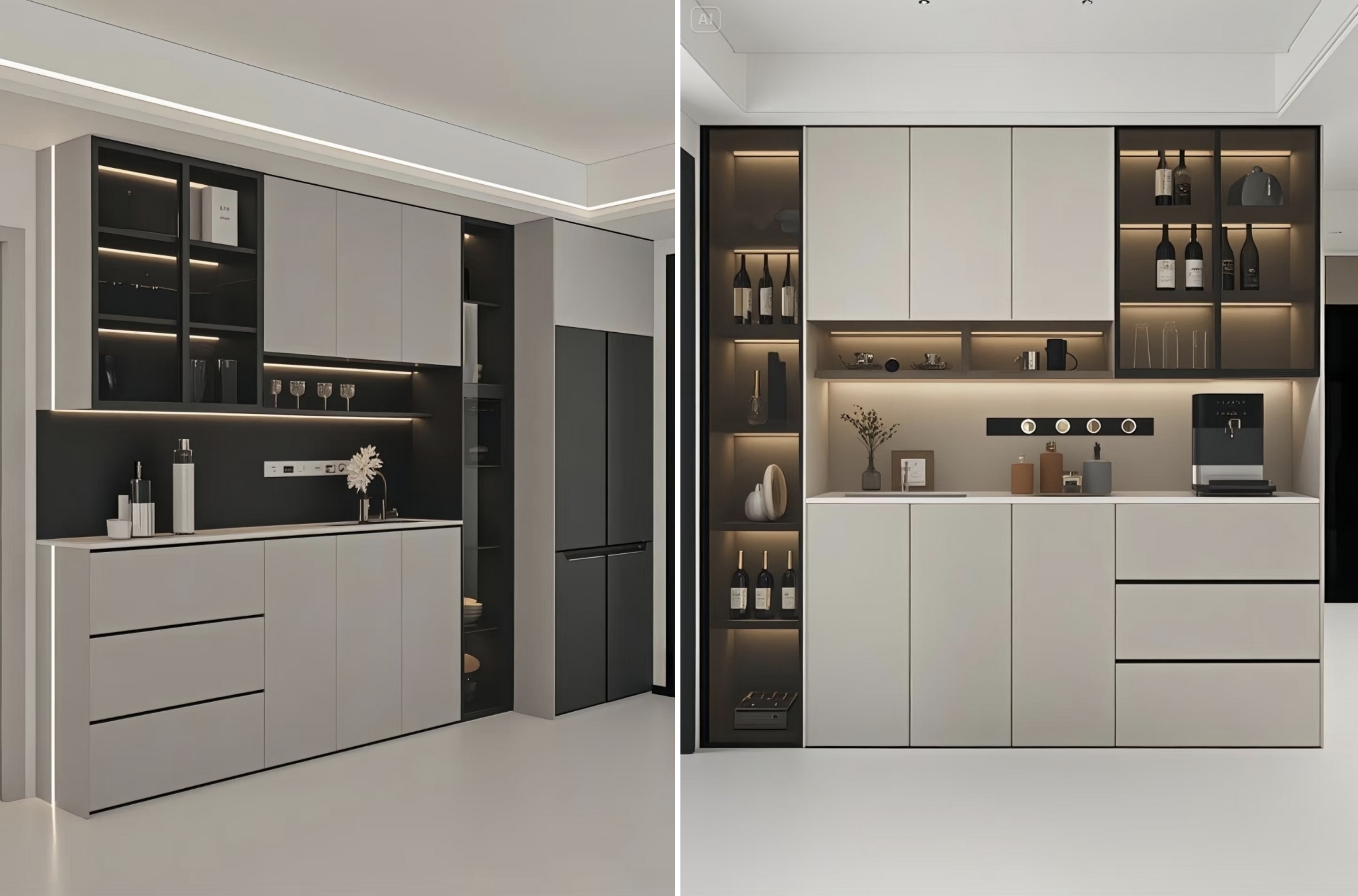 Kombinace uzavřených skříní s otevřenými policemi poskytuje dostatek prostoru pro skladování nádobí, vína a malých spotřebičů. Otevřené oblasti mohou také zobrazovat dekorativní předměty a do prostoru přidat dotek života.